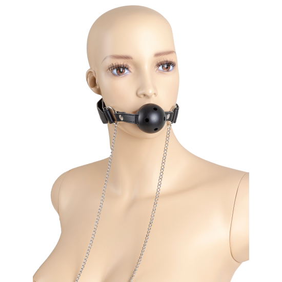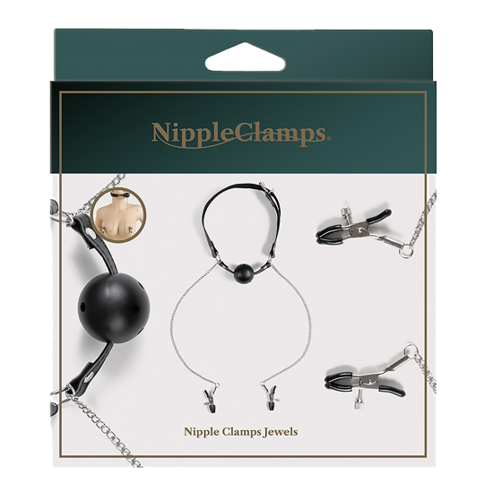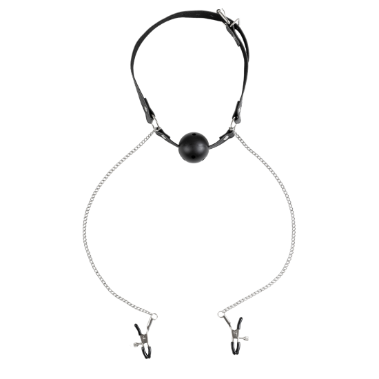 Mordaça respirável com pinças metálicas para a estimulação de mamilos.